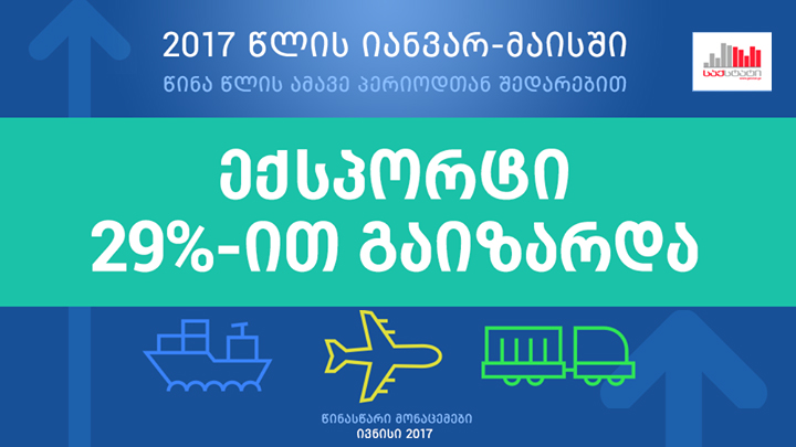 - Since September 2016, the annual growth of the goods export from Georgia is observed. The highest rate of the growth was recorded in January 2017 (by 45%). In February of the same year, the export was increased by 13%, in March – by 36.4% and by 22.9% in April. The export growth, along with the basic effect, was facilitated by the improved conditions at export markets.