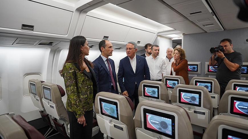 The Minister of Economy was accompanied by the Deputy Minister Mariam Kvrivishvili, the Director of the United Airports of Georgia, Irakli Karkashadze, the Head of the “Sakaeonavigatsia”, Gocha Mezvrishvili and the TAV Georgia Director General, Tea Zakaradze. President of the Georgian Airlines Group, Tamaz Gaiashvili introduced to the guests the main indicators and working principle of the aircraft, safety issues, high standards and other advantages of the ship. At this stage, the airline will operate flights using this aircraft to the cities of China, Thailand and India.