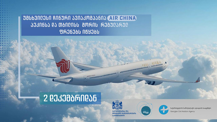 უმსხვილესი ჩინური ავიაკომპანია Air China საქართველოსა და ჩინეთის დედაქალაქებს შორის რეგულარულ საჰაერო მიმოსვლას იწყებს. ეკონომიკისა და მდგრადი განვითარების სამინისტროს სსიპ საქართველოს სამოქალაქო ავიაციის სააგენტოში წარმოდგენილი განაცხადის მიხედვით, პეკინსა და თბილისს შორის ფრენები მიმდინარე წლის 2 დეკემბრიდან, ქალაქ ურუმჩის გავლით შესრულდება.