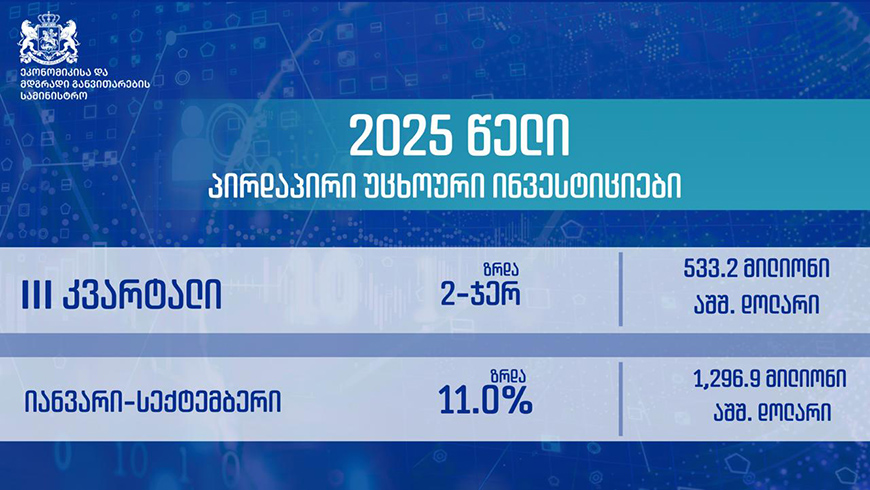 2025 წლის მესამე კვარტალში პირდაპირი უცხოური ინვესტიციები 2-ჯერ გაიზარდა და 533.2 მილიონი აშშ. დოლარი შეადგინა. იანვარ-სექტემბერში პირდაპირი უცხოური ინვესტიციების მოცულობა წინა წელთან შედარებით 11.0%-ით გაიზარდა და 1,296.9 მლნ. აშშ. დოლარი შეადგინა.