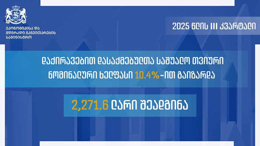 2025 წლის მესამე კვარტალში დაქირავებით დასაქმებულთა საშუალო თვიური ნომინალური ხელფასი გასული წლის ანალოგიურ პერიოდთან შედარებით 10.4%-ით (214.9 ლარით) გაიზარდა და 2,271.6 ლარი შეადგინა. რეალური ხელფასის ზრდა ამავე პერიოდში 5.6%-ს გაუტოლდა.